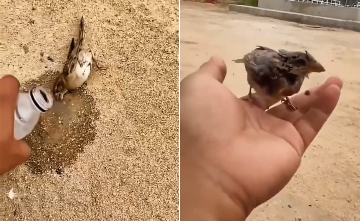वीडियो में देखा जा सकता है कि कैसे चिड़िया गर्मी से बेसुध होकर जमीन पर गिर चुकी है. ऐसा लग रहा था कि वो नहीं बचेगी. ऐसे में एक शख्स पानी की बोतल से पानी निकालकर गोरैया के ऊपर डालता है फिर उसे पिलाता है. शख्स ने मानवता की मिसाल कायम करते हुए गोरैया की जान बचाई है.