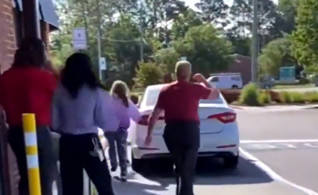 ये वायरल वीडियो शेयर हुआ है इम्पोस्टर नाम के ट्विटर हैंडल से. एक सफेद कार वाली महिला ड्राइव थ्रू विंडो के पास आकर रूकती है. पर न जाने क्या होता है कि महिला कार की फिक्र छोड़ कर उतरती है. वीडियो में देखने से लगता है कि महिला किसी कर्मचारी पर नाराज होने के बाद लड़ते हुए उतर रही है. बस इसी तैश में महिला ये भूल गई कि कार का ब्रेक लगाना है. महिला लड़ाई करने उतरती है और उधर कार भागना शुरू कर देती है. कार की रफ्तार इतनी तेज दिखाई दे रही है कि वो किसी के काबू में नहीं आई. कार तब ही रूकती है जब वो नीचे गिर जाती है. और कार की मालिकन उसके पीछे बेबस दौड़ती जाती है.