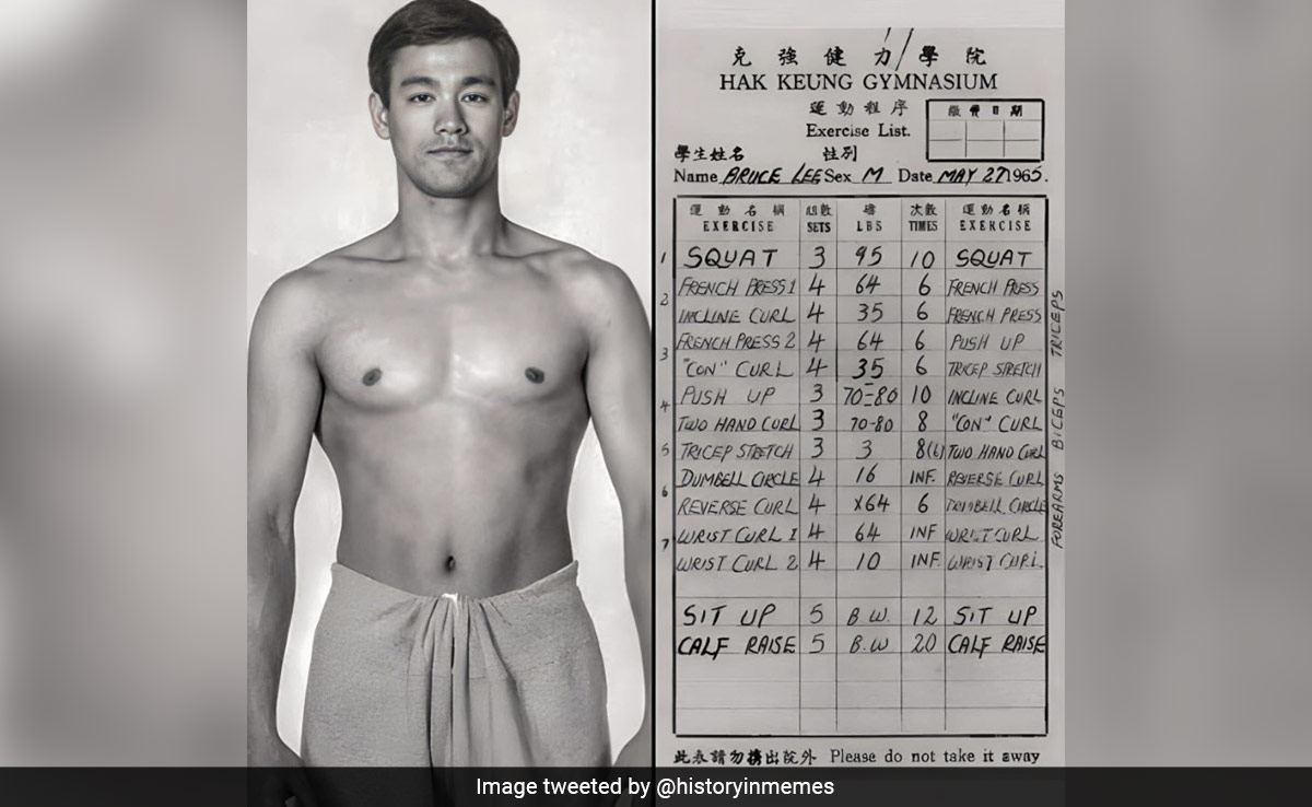 ब्रूस ली (Bruce lee) का नाम सुनते ही मन में एक ऐसे शख्स की छवि बन जाती है, जो मार्शल आर्ट किंग हो. उन्हें भला कौन नहीं जानता है. मार्शल आर्ट की दुनिया के किंग की पहचान हर जगह है. लोग बहुत ही सम्मान और अदब के साथ उन्हें याद करते हैं. 32 साल की छोटी सी उम्र में ब्रुस ली ने बहुत ही नाम कमा लिया. कई लोग उनसे प्रेरणा लेकर मार्शल आर्ट सीखने लगे हैं. अभी भले ही ब्रुस ली हमारे बीच में नहीं हैं, मगर उनका वर्कआउट की एक लिस्ट सोशल मीडिया पर वायरल हो रही है. एनडीटीवी इस तस्वीर की पुष्टि नहीं करता है. सोशल मीडिया पर यह तस्वीर इसी दावे के साथ शेयर किया जा रहा है.
