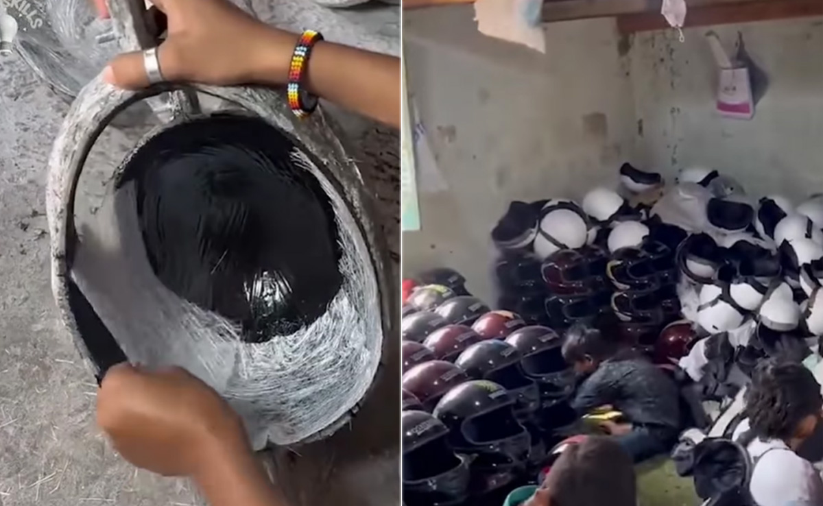 Natial drive नाम के इंस्टाग्राम अकाउंट से शेयर हुए वीडियो में कारखाने में एक मजदूर हेलमेट बनाता नजर आ रहा है. सबसे पहले वह एक ढांचे में काले रंग का एक लिक्विड लगाता है और उसे कलर करता है. इसके बाद सफेद पेपर उसके ऊपर चिपका कर उसे सूखने के लिए रख देता है. इसके बाद एक गहरे भूरे रंग का लिक्विड इसमें डाला जाता है और फिर इसे छोड़ दिया जाता है. आखिर में इस ढांचे के अंदर से हेलमेट को खोल कर निकाला जाता है और इसे साफ किया जाता है. इसके बाद इसमें अंदर पफ और हेलमेट के सामने लगने वाला फाइबर ग्लास लगाया जाता है.