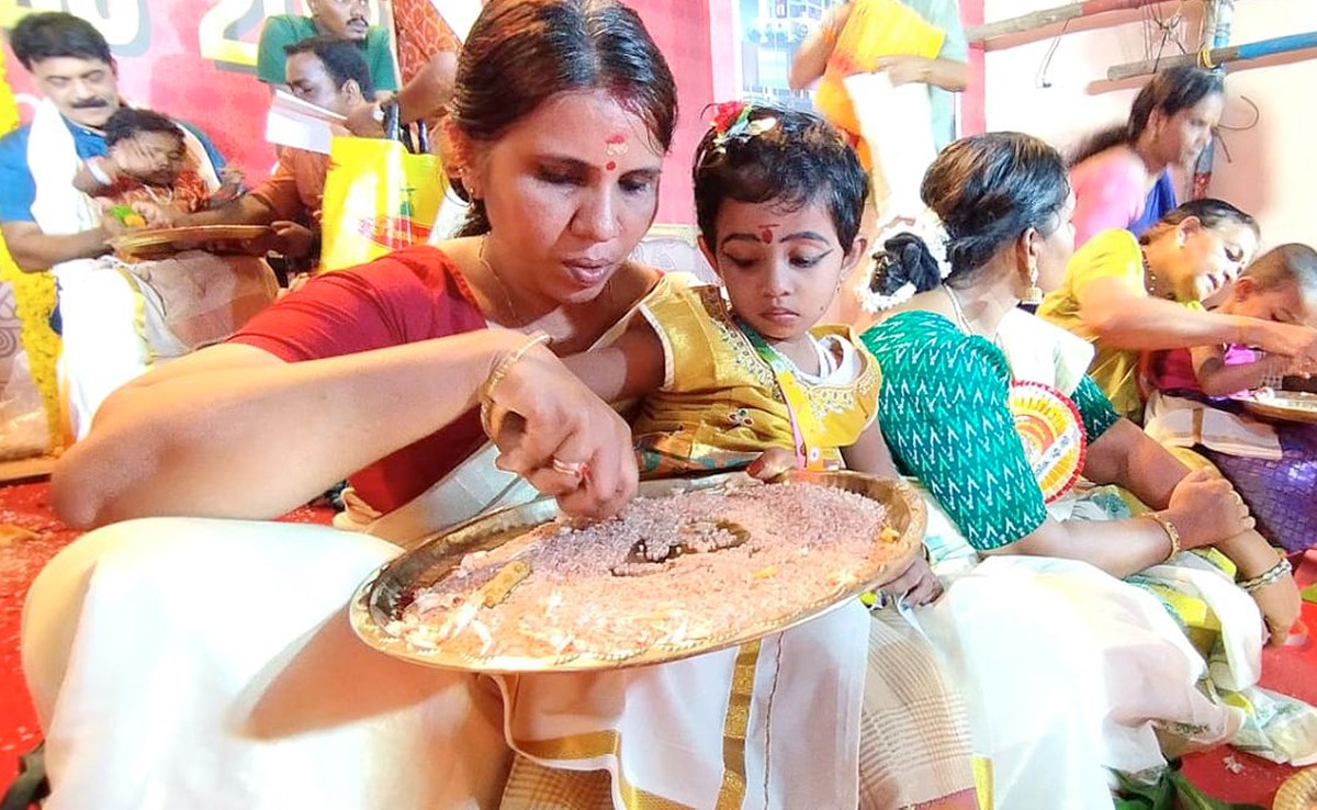 यह केरल की पारंपरिक प्रथा है. इस प्रथा में बच्चों को औपचारिक तौर पर अक्षरों के बारे में बताया जाता है. सोशल मीडिया पर कई लोगों ने तस्वीरें शेयर किया है.