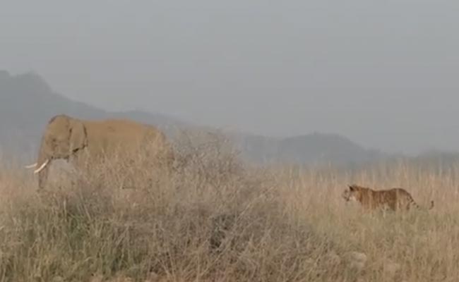 भारत के नेशनल पार्क्स में टाइगर या अन्य जंगली जानवरों को देखने के लिए पर्यटक दूर-दूर से आते हैं, और घने जंगलों में टाइगर की एक झलक पाने के लिए कई जतन भी करते हैं. कई बार तो पर्यटकों को टाइगर को देखे बिना ही बेरंग लौटना पड़ता है. लेकिन सोशल मीडिया पर वायरल हो रहे एक वीडियो में टाइगर ही नहीं बल्कि हाथी भी नज़र आ रहा है. इस वीडियो में हाथी और टाइगर आमने-सामने हैं, देखिए वीडियो.