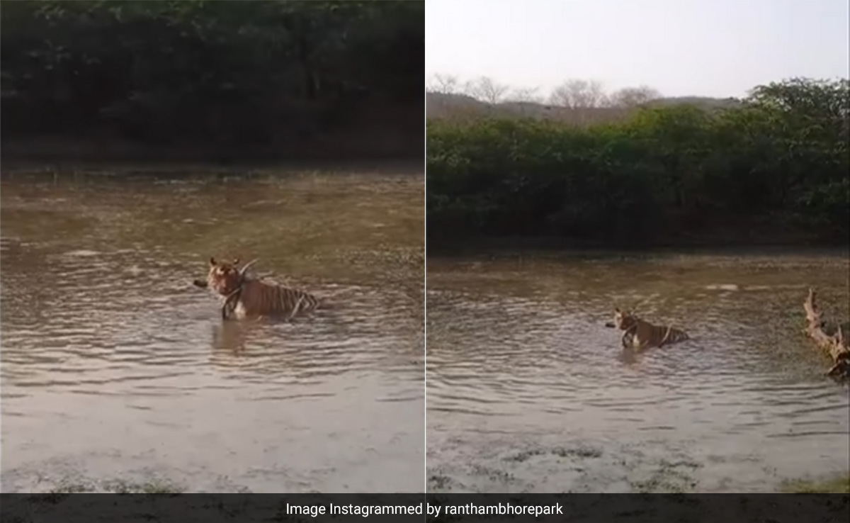 मार्च की शुरुआत में, रणथंभौर नेशनल पार्क में पर्यटकों को एक दुर्लभ दृश्य देखने को मिला, जब उन्होंने एक बाघ को अपने शिकार को पानी के गड्ढे में घसीटते हुए देखा.