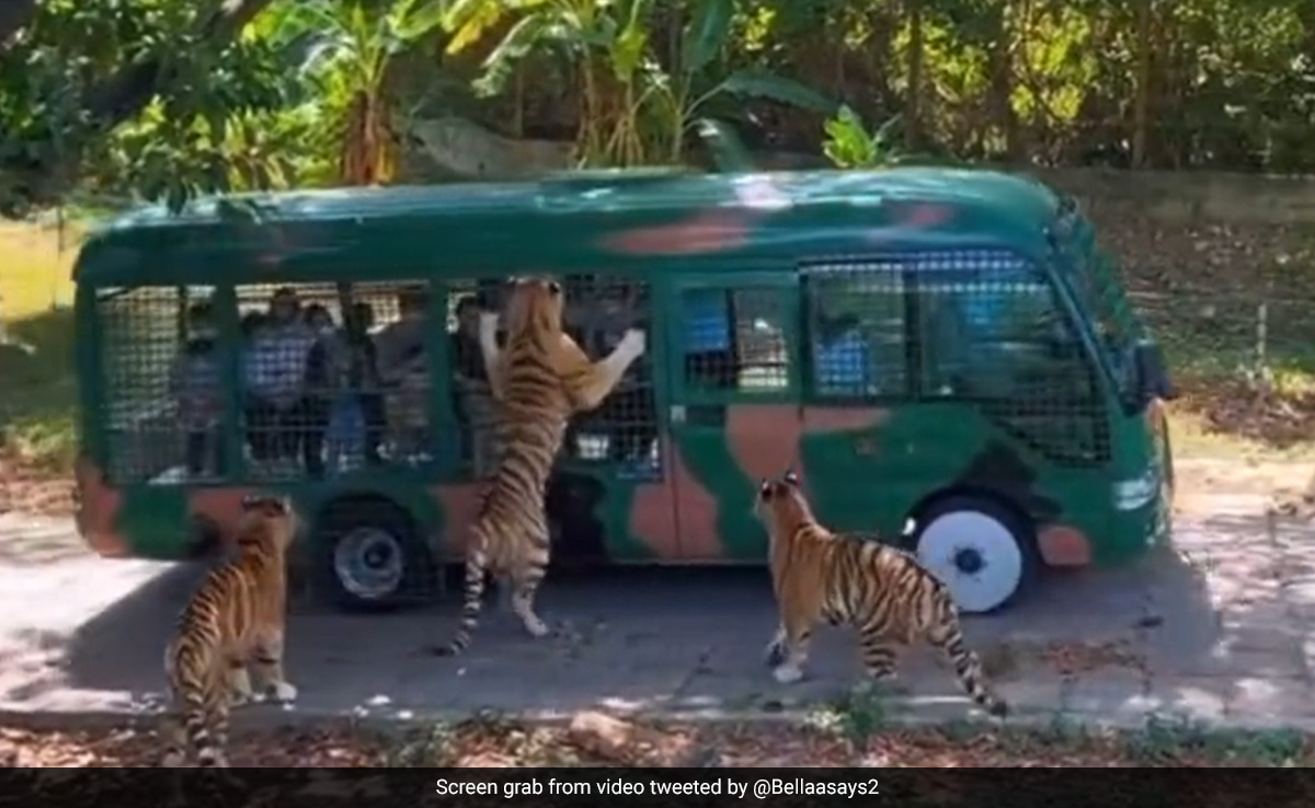 चौंका देने वाले इस वीडियो एक या दो नहीं, बल्कि तीन टाइगर टूरिस्ट बस का पीछा करते नजर आ रहे हैं. सोशल मीडिया प्लेटफॉर्म ट्विटर पर शेयर किए गए इस वीडियो में खौफनाक मंजर देखने को मिल रहा है. वीडियो में एक टूरिस्ट बस को बाघ के बाड़े से गुजरते देखा जा रहा है. इस बीच एक बाघ को उनका ये तरीका रास नहीं आया और वो जंगल सफारी की बस पर अटैक कर देता है. इस रोमांचक वीडियो को देखकर यकीनन किसी के भी पसीने छूट सकते हैं.