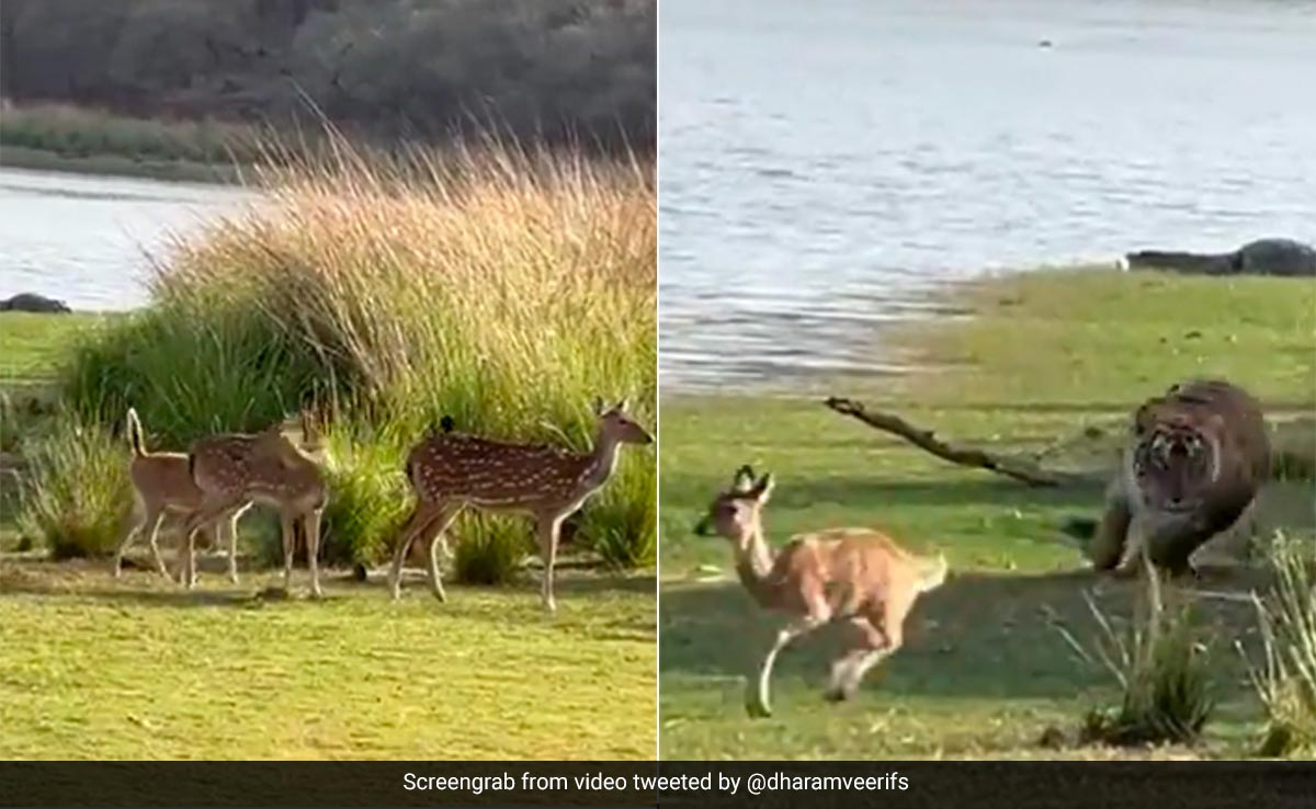 वायरल हो रहे इस वीडियो में आप देख सकते हैं कि नदी किनारे कुछ हिरण (Deer) पानी पीकर वहां से बड़े आराम से टहलते हुए दूसरी ओर जा रहे हैं. आसपास काफी शांति सी दिख रही है. लेकिन तभी झाड़ियों के बीच से कुछ आवाज़ आती है और वहां से एक बाघ अचानक बाहर निकलता है. पहले तो वो धीरे से बाहर आता है, लेकिन अचानक वो हिरणों पर हमला कर देता है. ऐसे में सभी हिरण वहां से भागने की कोशिश करते हैं, लेकिन एक हिरण को बाघ झपटकर दबोच लेता है. आगे बाघ ने उस हिरण का क्या किया वो आप इस वीडियो में देख ही सकते हैं.