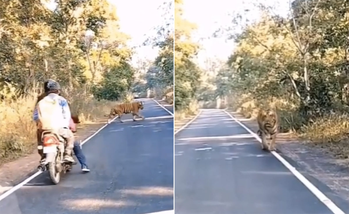 एक वीडियो इंस्टा पर तेजी से ट्रेंड कर रहा है, जिसमें एक बाइक पर सवार दो लोगों के सामने अचानक बाघ आ जाता है और वो अपनी बाइक रोक देते हैं और फिर धीरे-धीरे अपनी बाइक पीछे करने लगते हैं. बाघ भी उसी दिशा में धीरे-धीरे आगे बढ़ने लगता है. वीडियो में एक रुकी हुई कार भी नजर आ रही है, जो बाइक सवारों को बचाने के लिए थोड़ा आगे आ जाती है, लेकिन उसके ड्राइवर के सामने वो खतरा नहीं है, जो बाइक पर सवार लोगों के सामने है. उनका दिल अपनी जान की सलामती के लिए कितने जोर से धड़क रहा होगा. इसका आप और हम बस अंदाजा ही लगा सकते हैं.