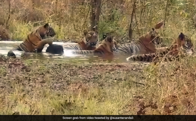 जंगली जानवरों (wild animals) को अपने प्राकृतिक आवास में आनंद लेते देखना हर किसी के लिए काफी दिलचस्प होता है. इंटरनेट पर एक वीडियो सामने आया है जिसमें बाघों के एक समूह को तालाब में आनंद लेते हुए दिखाया गया है. भारतीय वन अधिकारी (IFS) Indian Forest Officer (IFS) सुशांत नंदा (Susanta Nanda) द्वारा मंगलवार को ट्विटर पर शेयर किए गए वीडियो की शुरुआत एक तालाब में चार बाघों के साथ होती है. वीडियो एक और बाघ को बैठने के लिए एक अच्छी जगह की तलाश में घूमते हुए देखा जा सकता है, फिर वो एक पत्थर पर अपने पंजे रखकर तालाब के केंद्र में बैठ जाता है. बाघों को भी किसी चीज को देखते हुए देखा जा सकता है और फिर उनमें से एक वहां से जंगल की ओर चल देता है.