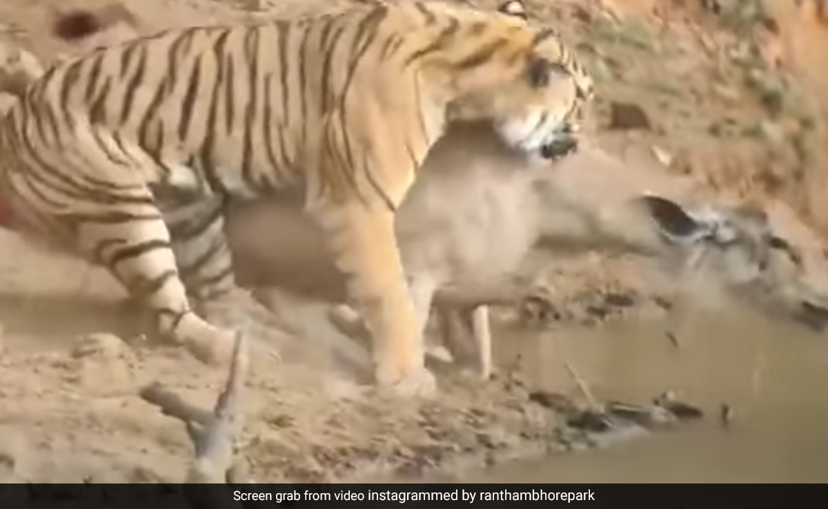 इस दृश्य का एक वीडियो राष्ट्रीय उद्यान अधिकारियों द्वारा 27 फरवरी को इंस्टाग्राम पर कैप्चर और साझा किया गया था. पोस्ट के कैप्शन में लिखा है, "दुर्लभ वन्यजीव फुटेज: बाघिन एक्शन में, रणथंभौर में सांभर हिरण का शिकार कर रही है."