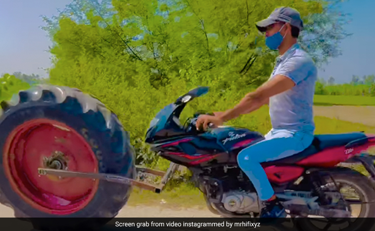इन दिनों लोगों को फेमस होने का ऐसा जुनून चढ़ा है कि इसके लिए लोग कुछ भी करते हैं और कुछ भी करने को तैयार हो जाते हैं. इंटरनेट पर लोग ऐसे-ऐसे वीडियो बनाकर डाल रहे हैं, जिन्हें देखने के बाद भी आपको अपनी आंखों पर भरोसा नहीं होगा. अपने वीडियो को वायरल करने के लिए लोग अजीबोगरीब कंटेंट क्रिएट कर रहे हैं. इसी होड़ में कुछ लोग नए-नए जुगाड़ इजात कर रहे हैं. कहीं कोई साइकिल में कार की स्टेयरिंग लगा दे रहा है, तो कहीं कोई जुगाड़ से पानी पर चलने वाली बाइक बना दे रहा है. इसी लिस्ट में एक शख्स की नई करामात यानी नया जुगाड़ शामिल हो गया है. इस शख्स ने पल्सर बाइक में ट्रैक्टर का पहिया लगाया है.