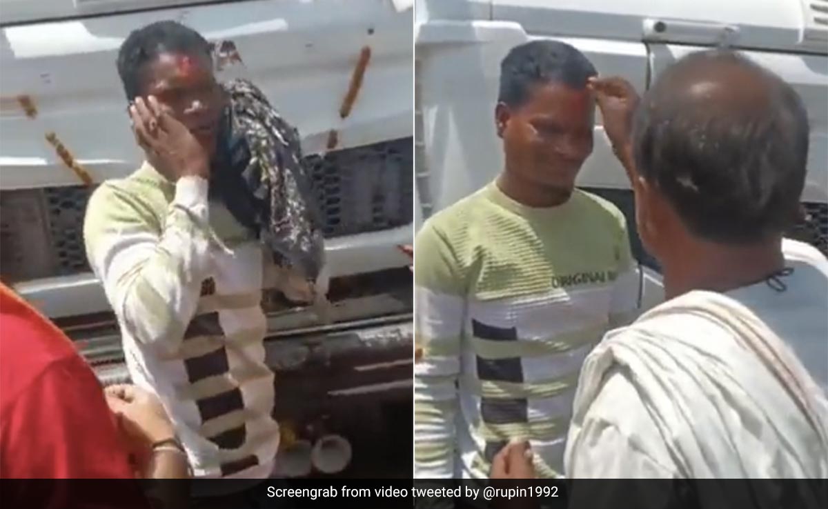 वायरल हो रहे इस वीडियो में आप देख सकते हैं कि एक ट्रक ड्राइवर को गाड़ी से उतारकर लोग गाड़ी के सामने की ओर लेकर आते हैं. कुछ लोगों ने हाथ में पूजा की थाली भी ली हुई है. जिसमें रोली और फूल माना लेकर खड़े हैं. जैसे ही ड्राइवर गाड़ी के आगे आकर खड़ा होता है, लोग उसके माथे पर तिलक लगाते हैं, ये देखकर ड्राइवर काफी खुश हो जाता है, लेकिन तभी कुछ लोग ड्राइवर को पकड़कर नीचे झुकाते हैं और उसके कान को हॉर्न के पास लगा देते हैं. इसके बाद ट्रक के हॉर्न को लगातार ज़ोर-ज़ोर से बचाते हैं. इतने में तो ड्राइवर का बुरा हाल हो जाता है और वो लोगों के सामने माफी मांगते हुए हाथ जोड़ने लगता है.