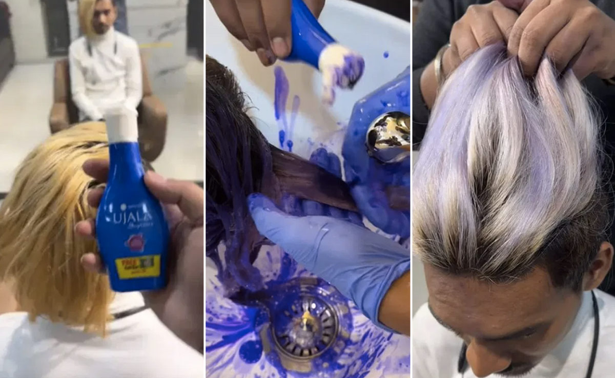 Stylist Uses Ujala To Dye Clients Hair: आज के समय में बालों में हेयर कलर करने का फैशन जोरों पर है. स्टाइलिश और फैशनेबल लगने के लिए बालों में कलर करना एक स्टाइल स्टेटमेंट बन गया है, जिसे आज कई लोग फॉलो कर रहे हैं. देखा जाए तो एक समय था जब बाल सफेद होने पर लोग हेयर डाई का इस्तेमाल करते थे, लेकिन अब जमाना बदल गया बालों को अलग-अलग कलर से रंगने का ट्रेंड खूब फॉलो किया जा रहा है. अब चाहे बाल सफेद हो या ना हो, हर उम्र के लोग स्टाइल के चक्कर में अपने पसंद का रंग बालों में करवा कर स्टाइलिश लगने की हर संभव कोशिश में जुटे हैं. इसी कड़ी में हाल ही में सोशल मीडिया पर एक हेयर स्टाइलिस्ट का गजब का एक्सपेरिमेंट वायरल हो रहा है, जिसे देखकर कोई मौज ले रहा है, तो कोई भड़क रहा है.