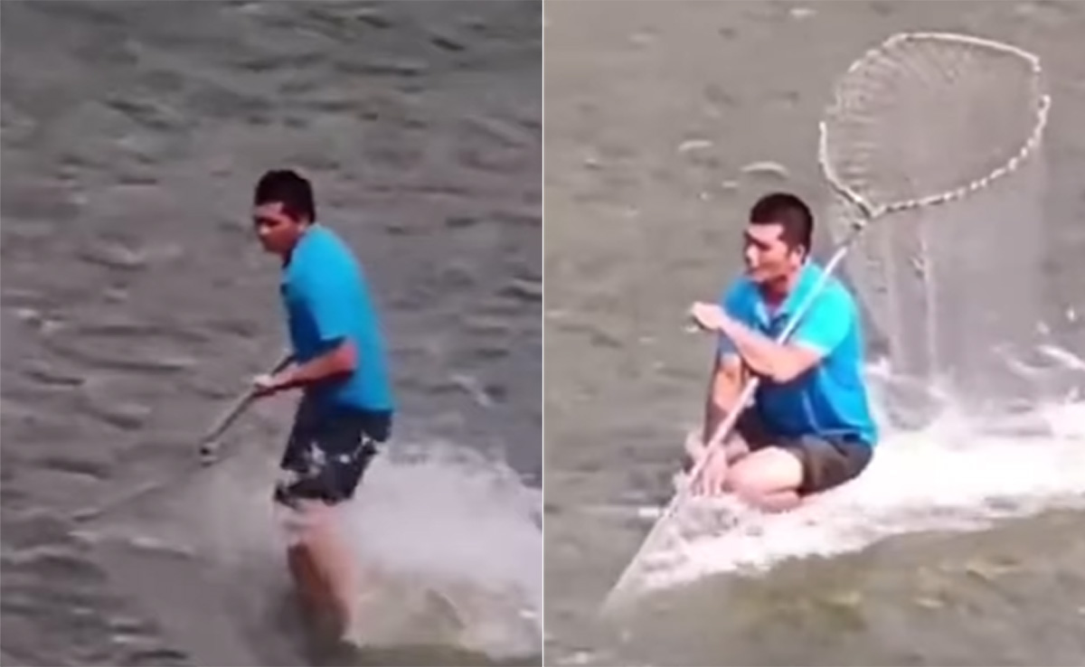 वीडियो की शुरुआत में आप देखेंगे कि एक शख्स पानी के बीच मछली पकड़ने वाली नेट लेकर बैठा हुआ है. वीडियो में आगे आप देखेंगे कि, शख्स खड़ा होता है और तेज दौड़ते हुए नेट से मछलियां पकड़ने लगता है. इस वीडियो को देखकर यकीनन एक मिनट के लिए आप भी धोखा खा जाएंगे कि, आखिर शख्स पानी के ऊपर दौड़ कैसे रहा है, लेकिन इसके पीछे की कहानी कुछ और है.