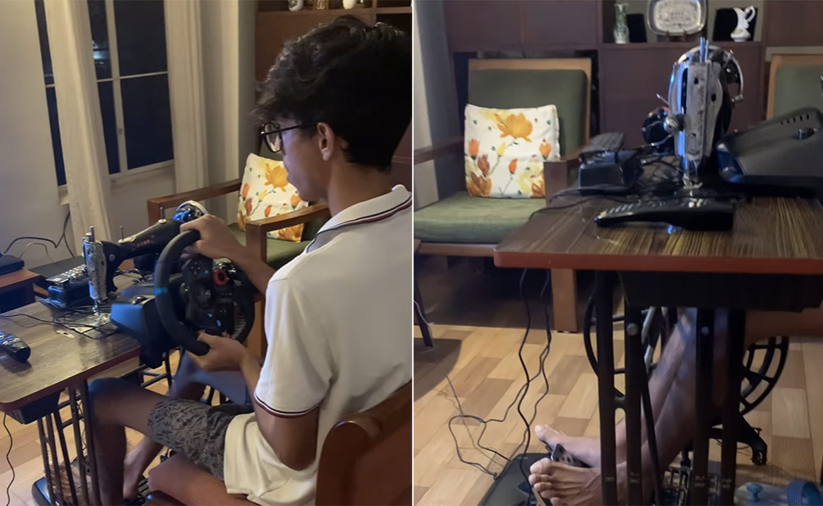 इंस्टाग्राम पर jose_ootta नाम से बने पेज पर एक शख्स का वीडियो शेयर किया गया है. यह शख्स अपने बड़े से टीवी पर प्लेस्टेशन खेल रहा है, लेकिन इसे खेलने के लिए इसमें जो जुगाड़ लगाया गया है, उसे देखकर आपका दिमाग भी घूम जाएगा. दरअसल, इस बंदे ने पुरानी सिलाई मशीन को यूज करते हुए इसकी टेबल पर एक स्टीयरिंग व्हील लगा दिया है, जिससे पूरा गेम ऑपरेट हो रहा है. इतना ही नहीं स्पीड को मेंटेन करने के लिए नीचे एक्सीलेटर और ब्रेक भी लगाया हुआ है और आराम से ये बंदा चेयर पर बैठकर टीवी पर अपनी कार को ड्राइव कर रहा है.