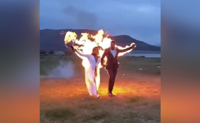 वीडियो में देखा जा सकता है कि शादी को तैयार दूल्हा और दुल्हन एक दूसरे का हाथ थामे खड़े होते हैं, इतने में उनके शरीर में आग लगा दी जाती है और वह मुस्कुराते हुए उस आग के साथ एक दूसरे के हाथों में हाथ डाले वॉक करने लगते हैं. दुल्हन ने सफेद कलर का गाउन पहना हुआ है, जिसके पीछे के हिस्से में आग की लपटे उठती साफ नजर आती हैं. वहीं दूल्हा कोट पैंट में आग के साथ लिपटा दिखता है. दोनों ऐसे शान से चलते हैं जैसे आग उनपर कोई असर ही न डाल रही हो. वीडियो को देखने वालों की आंखें तो फटी की फटी रह जाती हैं और मन में डर सताता रहता है कि कहीं कोई घटना न घट जाए. हालांकि ऐसा कुछ नहीं होता और दूल्हा-दुल्हन सुरक्षित रहते हैं.