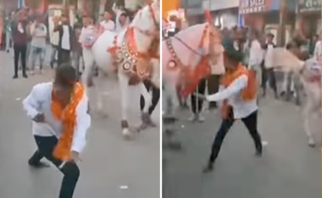 दरअसल, वीडियो में शख्स के डांस स्टेप्स घोड़े को कुछ खास पसंद नहीं आते. वीडियो को देखकर तो यही अंदाजा लगाया जा सकता है कि शख्स का डांस देख घोड़े के दिमाग का दही हो गया, जिसके बाद उसने आव देखा न ताव और शख्स को जोरदार लात मार दी. घोडे़ की जोरदार लात खाकर शख्स हवा में उछालता हुआ जमीन पर जा गिरा. वी़डियो में देखा सकता है कि घोड़े के हमले के बाद शख्स को चोटें तो आई होंगी.