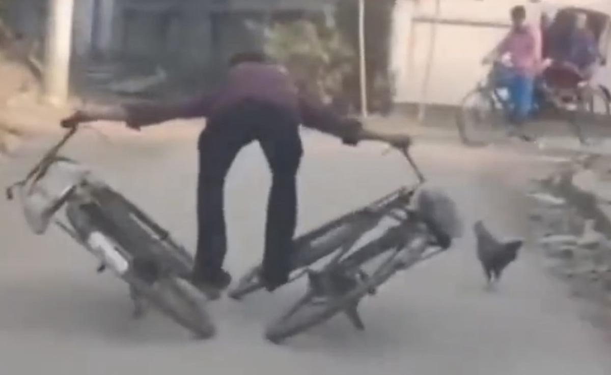 हमारे देश में टैलेंट की कमी नहीं है और इसकी बानगी आए दिन हमें नजर आती रहती हैं, जहां पर लोग देसी जुगाड़ से नायाब चीजें बना देते हैं. आज एक ऐसा ही वीडियो हम आपके साथ शेयर करने जा रहे हैं जिसे देख कर एक पल के लिए तो आप हक्के बक्के रह जाएंगे. इस वीडियो में एक शख्स दो साइकिल पर शानदार स्टंट करता नजर आ रहा है. तो चलिए आपको भी दिखाते हैं इस शख्स की शानदार इनोवेशन.