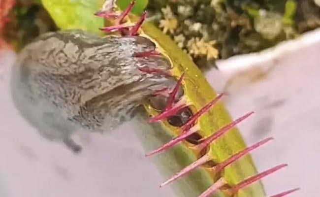 वीडियो में देखा जा सकता है कि एक छोटा सा कीड़ा, एक पौधे के बीच जाकर फंस जाता है. इस पौधे को देख कर ऐसा लगता है जैसे कटीले दांतों वाला कोई राक्षस हो जिसने किसी जीव को निगल कर अपना मुंह बंद कर लिया हो और अंदर दबा जीव जान बचाने के लिए तड़प रहा हो. दरअसल इस पौधे का नाम वीनस फ्लाईट्रैप है, जो एक कार्निवोरस पौधा है. इस पौधे के ऊपर अगर कोई मक्खी, कीड़ा, तितली आदि बैठ जाती है तो ये तुरंत बंद हो जाता है. वीडियो में देखा जा सकता है कि एक कीड़ा जैसे ही पौधे के पास जाता है, उसका कांटेदार मुंह बंद हो जाता है. इसके बाद वह कीड़ा छटपटाते हुए अपनी जान को बचाने की कोशिश में लग जाता है. उनकी हिम्मत की जीत होती है और आखिरकार वह अपनी जान बचा पाने में सफल होता है.