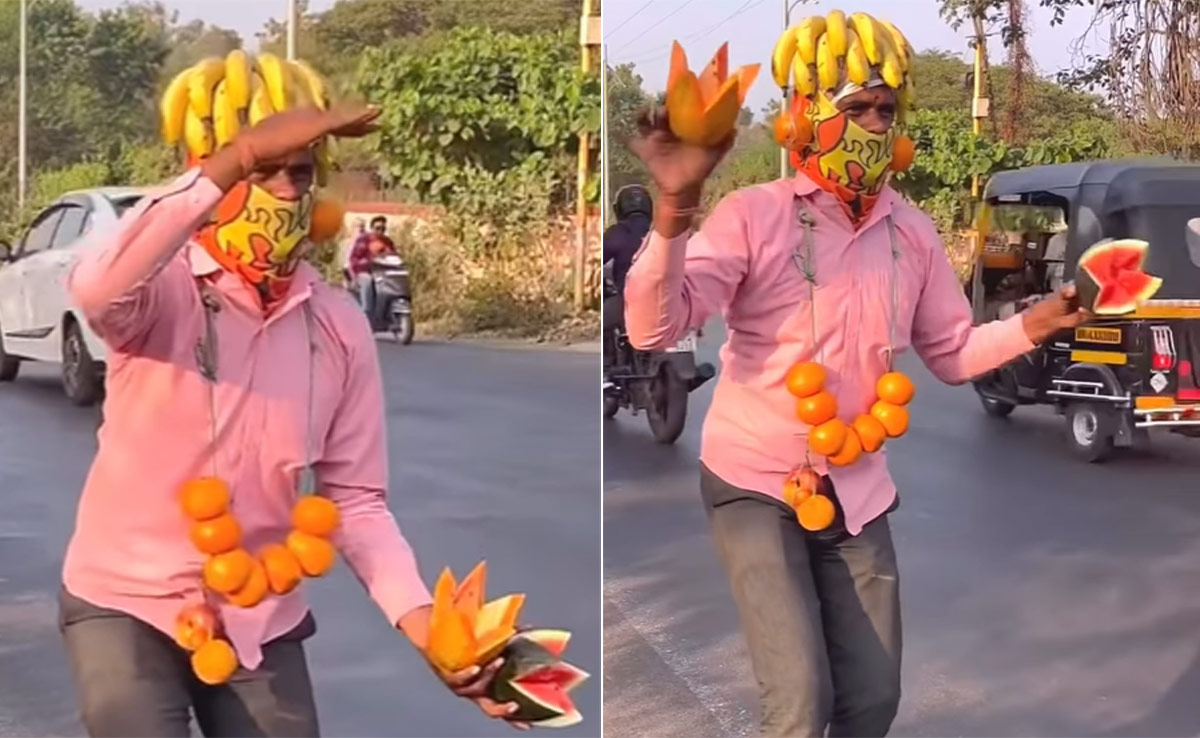 zindagi.gulzar.h नाम के इंस्टाग्राम अकाउंट से इस वीडियो को शेयर किया गया है, जिसमें एक शख्स फलों को अजूबी तरीके से बेचता दिख रहा है. वह सड़क किनारे फलों से बना मास्क पहने नजर आता है. सिर पर केले और संतरे सजा रखें हैं, तो गले में संतरों की माला शोभ रही है, शख्स ने एक हाथ में पपीता पकड़ा है और दूसरे में तरबूज. वीडियो में शख्स पोज देते हुए फलों को डिस्प्ले करता नजर आ रहा है. इस फ्रूट वाले का वीडियो देखकर लोग अपनी हंसी रोक नहीं पा रहे हैं.