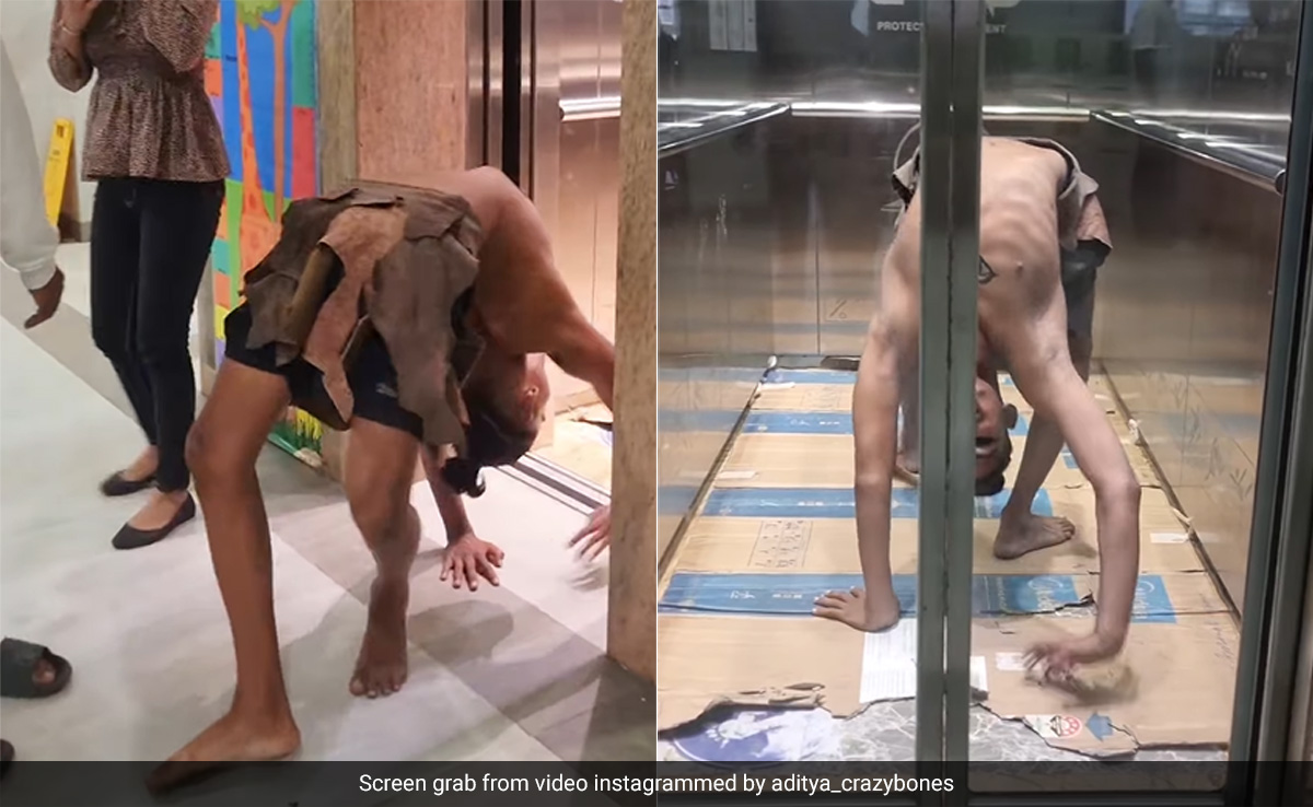 इंस्टाग्राम हैंडल आदित्य क्रेजी बोन्स ने ये वीडियो शेयर किया है, जिसका कैप्शन है, 'मैं लिफ्ट कैसे यूज करता हूं.' खुद को बोन ब्रेकर बताने वाला ये शख्स लिफ्ट के पास पहुंचता है और अचानक ब्रिज पोज में झुक जाता है और आगे बढ़ने लगता है. उस युवक की ऐसी चाल देखकर हॉलीवुड मूवी के घोस्ट की याद आती है. आसपास वाले भी उसे देखकर चौंक जाते हैं, लेकिन युवक बेधड़क आगे बढ़ता है. उसी तरह ब्रिज पोज में झुके-झुके ही लिफ्ट में घुसता है. कांच के गेट वाली लिफ्ट में वो इसी अंदाज में वो फ्लोर चुनता है, जहां उसे जाना है और उसके बाद फ्रेम में वेव करता हुआ नजरों से ओझल हो जाता है.