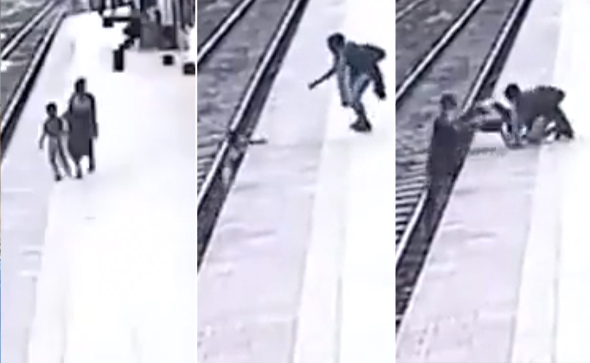 ट्रेन के आने की ठीक पहले बच्चे को पटरियों से हटाया