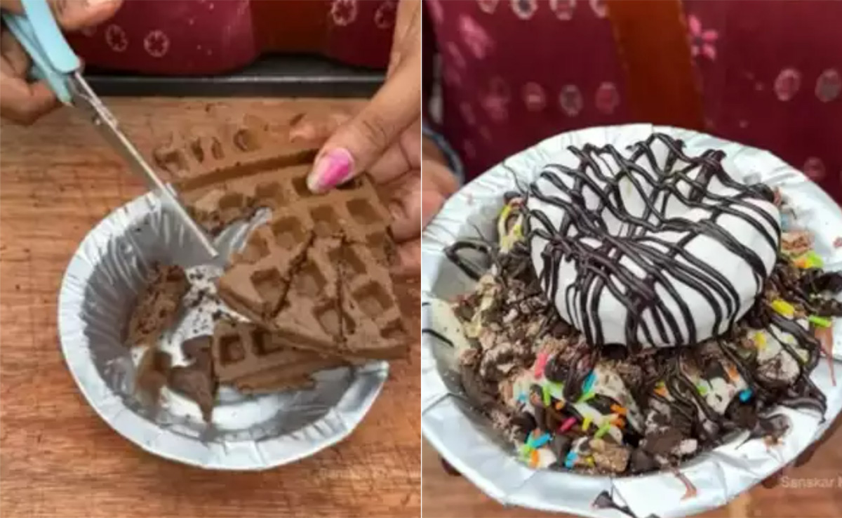दरअसल, सूरत की एक वेंडर ने एक्सपेरिमेंट करते हुए एक ऐसी नई डिश को बनाया है, जिसके इन दिनों सोशल मीडिया पर खूब चर्चे हो रहे हैं. इसे 'वैफल भेल' का नाम दिया गया है. वीडियो में वेंडर बड़ी ही खूबसूरती से इस वैफल भेल को प्रजेंट करती नजर आ रही हैं. वीडियो में देखा जा सकता है कि, वेंडर सबसे पहले एक वैफल को तोड़कर सजा रही है, जिस तरह प्लेट में पापड़ी और भेल को सजाया जाता है. इसके बाद वैफल के टुकड़ों पर चॉकलेट सिरप डालती हैं. उसके बाद चॉकलेट सॉस के साथ स्प्रिंकल कर आइसक्रीम से उसे सजा देती हैं. आखिर में आइसक्रीम के ऊपर भी चॉकलेट सिरप, चॉकलेट सॉस डालकर गार्निशिंग कर दी जाती है.