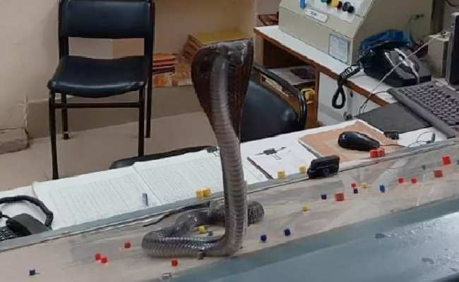 Watch Cobra Video: कोबरा...जिसके नाम भर से ही डर के मारे लोगों के रोंगटे खड़े हो जाते हैं और अगर गलती से भी उसका सामना हो जाए, तो डर से थर-थर कांपना लाजिमी है. ऐसा ही हाल देखने को मिला कोटा मंडल के रावठा रोड स्टेशन में, जिसकी एक तस्वीर इन दिनों इंटरनेट पर अच्छे-अच्छों के पसीने छुड़ा रही है. दरअसल, हाल ही में कोटा रेलवे स्टेशन के पैनल रूम में एक बिन बुलाया 'गेस्ट' टेबल पर फन फैलाए बैठा नजर आया, जिसके डर से स्टेशन मास्टर टेबल के पीछे बेंच पर चढ़कर बैठ गए.