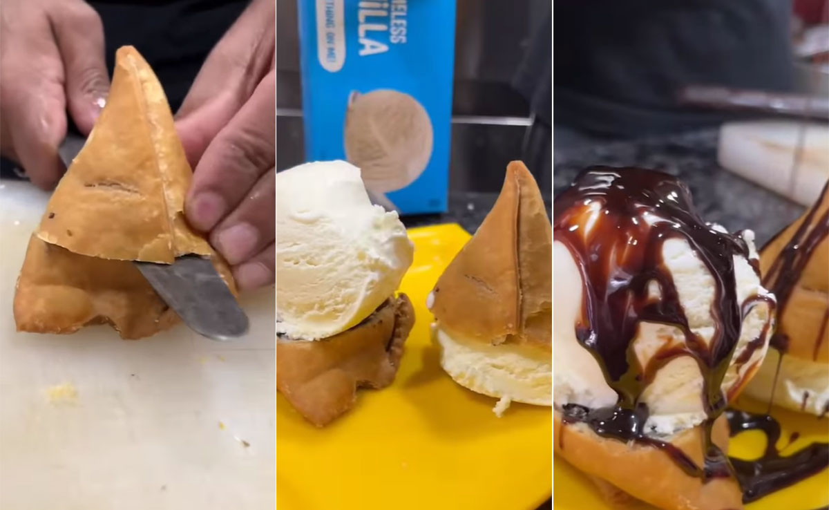 इंस्टाग्राम पर oodie_tshr नाम के अकाउंट से शेयर हुए वीडियो में एक शख्स समोसे को बीचों बीच से काटता है और उसके एक हिस्से को पहले प्लेट में रखता है और उसके ऊपर वह वनीला आइसक्रीम डालता है. इसके साथ ही वह आइसक्रीम की एक और स्कूप रखता है और आधे बचे समोसे को उसके ऊपर रख देता है. इसके ऊपर से वह चॉकलेट सिरप डालता है. हालांकि, समोसे के अंदर आलू नहीं, बल्कि चॉकलेट केक भरा नजर आता है.