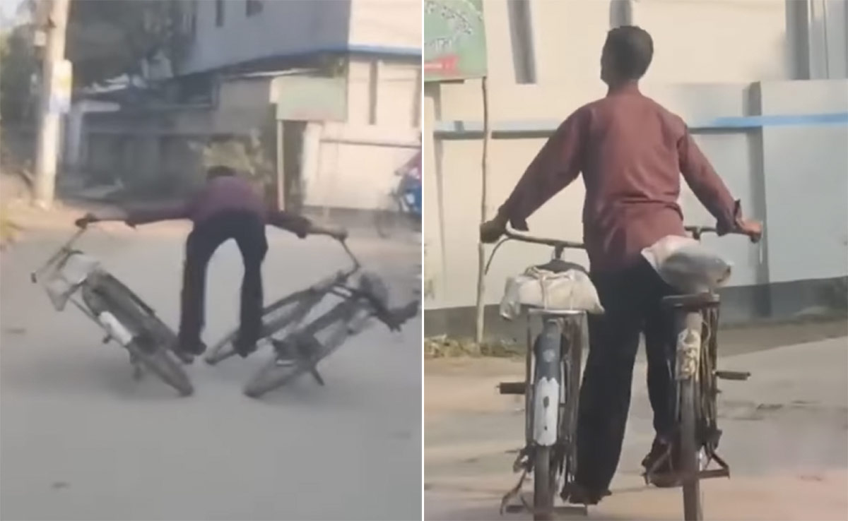 वायरल हो रहे इस वीडियो में एक शख्स एक नहीं, बल्कि एक साथ दो-दो साइकिलों को अजीबोगरीब ढंग से चलाता नजर आ रहा है. यकीनन आपने शायद ही इससे पहले ऐसा कोई स्टंट देखा होगा. यूं तो इंटरनेट पर स्टंटबाजों के ये हैरतअंगेज स्टंट आसान नहीं होते. इनके पीछे काफी मेहनत छिपी होती है, जिसके बाद ही ये निखर के सामने आते हैं, जैसा कि वायरल हो रहे इस वीडियो में देखने को मिल रहा है. वीडियो में एक शख्स दो-दो साइकिलों पर सवार होकर गली-मोहल्लों से होते हुए नागिन से बलखाता नजर आ रहा है.