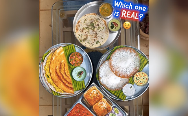 वीडियो में डोसा सांभर, अप्पम, स्टू सूप और उत्तपम की थाली के साथ पाव भाजी दिखाई दे रही है, जिनमें से कुछ असली और कुछ पेंटिंग. यूं तो आपने कई प्रकार की कलाकृतियां देखी होगीं, लेकिन हाल ही में वायरल हो रहे इस वीडियो में छिपी पेंटिंग को देखने के बाद उसमें से असली और नकली में फर्क कर पाना पहली नजर में मुश्किल है. इस कलाकृति को रुचा नाम की एक कलाकार ने बनाया है, जो वाकई होश उड़ा देने वाली है. सोशल मीडिया प्लेटफॉर्म पर इस वीडियो को रुचा-चैतन्य के कम्बाइंड इंस्टाग्राम पेज पर शेयर किया गया है. वीडियो को शेयर करते हुए कैप्शन में लिखा गया है, 'ये पेंटिंग अब अपने नए घर में पहुंच गई हैं. मैंने अप्पम पेंटिंग के साथ एक और पाव भाजी और डोसा पेंटिंग बनाई. ये तीनों अब अपने घर में खुशी-खुशी रह रहे हैं.'