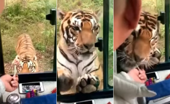 Man Opened The Bus Window To Feed A Tiger: इंटरनेट की दुनिया में वीडियोज की भरमार है, जहां रोजाना एक से बढ़कर एक वीडियोज सामने आते हैं. इनमें कुछ वीडियोज काफी फनी होते हैं, तो कुछ हैरान करने वाले होते हैं. इनमें जानवरों से जुड़े वीडियोज भी यूजर्स को खूब पसंद आते हैं, लेकिन हाल ही में वायरल हो रहा एक वीडियो हर किसी की हालत खराब कर रहा है. वायरल हो रहे इस वीडियो में एक शख्स बस की खिड़की खोलकर बाघ को खाने की 'दावत' देता नजर आ रहा है. वीडियो में शख्स की इस हरकत को देख हर कोई हैरान है.
