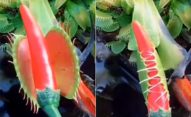 यूं तो दुनिया में पौधों की कई प्रजातियां पाई जाती हैं, इनमें से कुछ मांसाहारी यानी कार्निवोरस पौधे (Carnivorous Plant) भी होते हैं, जो हमेशा अपने शिकार की तलाश में रहते हैं. ज्यादातर पौधे कीड़े-मकौड़े (Insects) पर अटैक करे, उन्हें अपना भोजन बना लेते हैं, लेकिन कुछ पौधे ऐसे भी होते हैं, जो अपने एक ही डंक से इंसान की जिंदगी भी खतरे में डाल सकते हैं. हाल ही में वायरल हो रहे इस वीडियो की शुरुआत में एक कार्निवोरस पौधे मुंह खोले नजर आ रहा है. इस बीच उसके मुंह में एक लाल मिर्च रख दी जाती है, जिसके बाद लाल मिर्च का स्वाद चखते ही पौधे की हालत खराब हो जाती है.