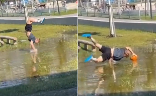 इंटरनेट पर तेजी से वायरल हो रहे इस वीडियो में सबसे पहले एक शख्स नजर आ रहा है, जो पानी में गई बॉस्केटबॉल को निकालने के लिए की कोशिश करता नजर आ रहा है. इस दौरान शख्स अपनी कमाल की फिटनेस एक नजराना पेश करता है, जिसे देखकर एक मिनट के लिए आप भी दंग रह जाएंगे. वीडियो में शख्स पानी में गई बॉल को निकालने के लिए अपने पैर पर चलकर जाने के बजाए अपने हाथों पर चलते हुआ नजर आ रहा है. पानी के बीच में पहुंचकर शख्स एक हाथ से खुद को संभालते और दूसरे हाथ से बॉल निकालकर अपने एक साथी के पास फेंक देता है. हालांकि इस दौरान शख्स का बैलेंस थोड़ा डगमगाता भी है, लेकिन इसके बावजूद वो खुद को संभालते हाथों के बल पानी से बाहर आ जाता है.
