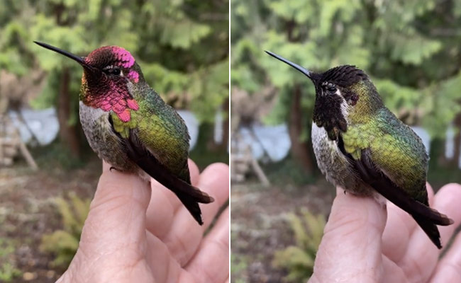 जैसे गिरगिट अपनी स्किन का कलर सेकंड्स में बदलने के लिए जाना जाता है, ठीक वैसे ही ऐसा लग रहा है जैसे- हमिंग बर्ड को भी इस लिस्ट में ऐड कर दिया गया है. इन दिनों सोशल मीडिया पर तेजी से वायरल हो रहे इस वीडियो को देखकर आप भी कुछ ऐसा ही कहेंगे. मंत्रमुग्ध कर देने वाली इस छोटी सी क्लिप में हमिंग बर्ड को दिखाया गया है, जो एक आदमी के हाथ पर बैठा है और धीरे-धीरे चमकीले गुलाबी रंग में तब्दील होने से पहले गहरे हरे से काले रंग में बदल रहा है. ये सभी रंग तब बदलता है, जब ये पक्षी अलग-अलग दिशाओं में अपना सिर घुमाता है. इंटरनेट पर जिसने भी इस प्यारे से मंत्रमुग्ध कर देने वाले वीडियो को देखा, बस देखता ही रह गया.