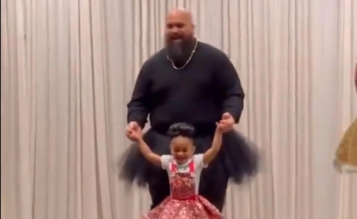 इस वीडियो में देखा जा सकता है कि किसी बैले डांस स्कूल का स्टेज शो हो रहा है. क्रिसमस के अवसर पर हो रहे इस डांस शो में छोटे छोटे बच्चे पार्टिसिपेट कर रहे हैं. छोटी बच्चियों के साथ उनके पैरेंट्स खास तौर पर मांएं पार्टनर बनी हैं और तैयार होकर स्टेज पर आई हैं. लेकिन लोग तब दिल थाम लेते हैं जब स्टेज पर सबसे पहले एक लंबे चौड़े डैड की इंट्री अपनी छोटी सी बेटी के साथ होती है. बड़ी सी दाढ़ी और सिर पर बिना बाल के यह डैड काले रंग का बैले ड्रेस भी पहने हैं जिनकी कमर पर काले रंग का फर वाला स्कर्ट भी है. वह एक परफेक्ट पार्टनर की तरह अपने नन्हे पार्टनर यानी बेटी का साथ देने के लिए हर वो स्टेप कर रहे हैं जो अन्य कपल्स कर रहा है. 1 मिनट 16 सेकंड के इस वीडियो में क्यूटनेस की हद देखी जा सकती है.
