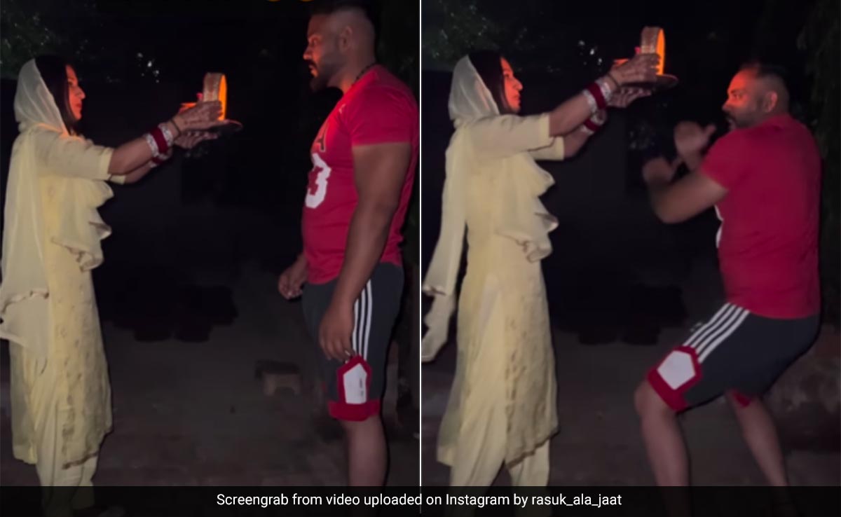 वीडियो को rasuk_ala_jaat नाम के अकाउंट से शेयर किया गया है. वीडियो में पति-पत्नी करवा चौथ की रात इस त्योहार को सेलिब्रेट करते दिखते हैं. महिला छलनी से चांद को देख उससे अपने पति को देखती है और आरती उतारती है. लेकिन तभी पति झूम-झूम कर नागिन डांस करता दिखता है. उसकी हरकत देख महिला अपनी हंसी नहीं रोक पाती. इस मजेदार वीडियो को सोशल मीडिया पर खूब पसंद किया जा रहा है.