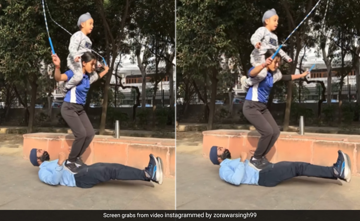 वायरल वीडियो में जोरावर सिंह के साथ आप उनकी पत्नी और बेटे को भी देख सकते हैं. आप देखेंगे कि पहले जोरावर जमीन पर लेटते हैं. उसके बाद उनकी पत्नी उनके पेट के ऊपर खड़ी होती हैं, फिर पत्नी ने अपने कंधे पर अपने बेटे को भी बैठा लिया है. इसके बाद वो ज़ोरावर के पेट पर खड़े होकर ही रस्सी कूदना शुरू कर देती हैं. इस स्टंट को इंटरनेट यूजर्स काफी पसंद कर रहे हैं. जोरावर ने इंस्टाग्राम पर ये वीडियो शेयर करते हुए लिखा है- पागलपन का स्तर.