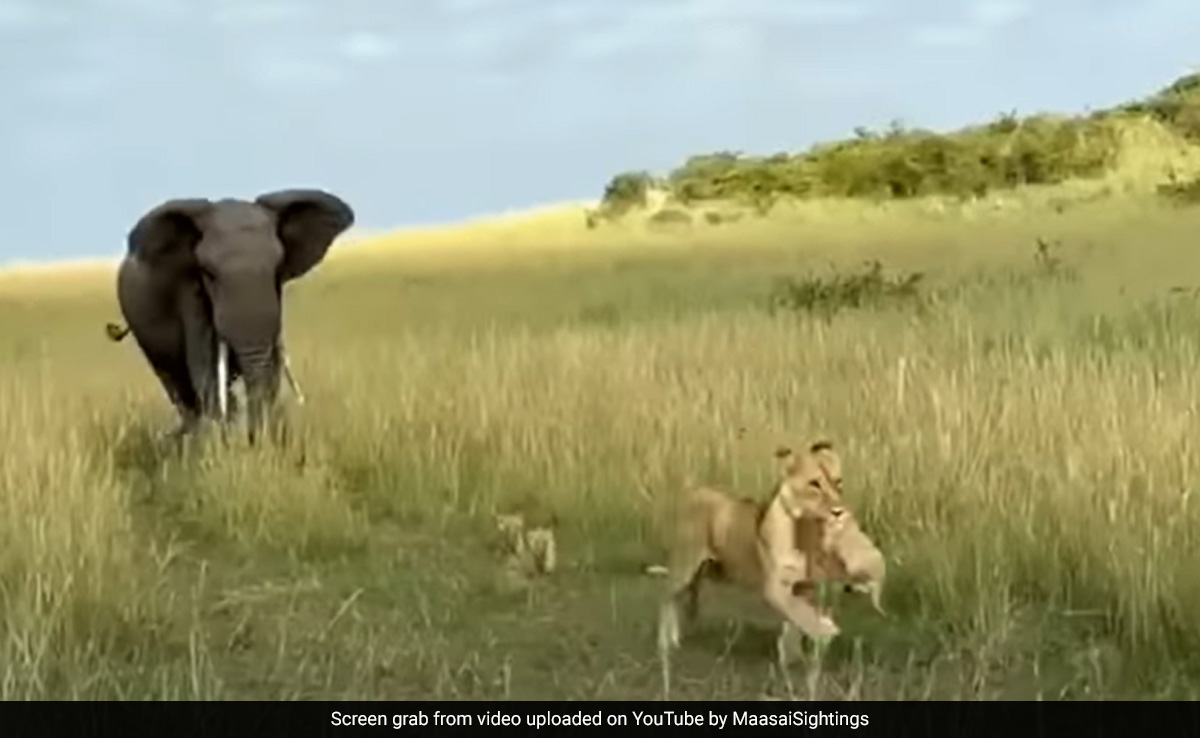 बच्चों के साथ मस्ती कर रही शेरनी को जंगली हाथी ने दौड़ाया, देखें VIDEO