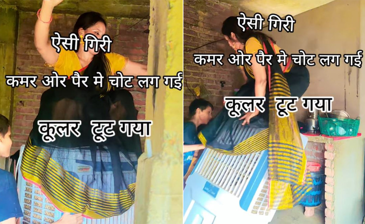 Suman Sain नाम के यूजर ने इस वीडियो को शेयर किया है. वीडियो में काले रंग की साड़ी में एक महिला कूलर पर बैठी नजर आ रही हैं. इस दौरान दो बच्चे पहियो वाले इस कूलर को धक्का लगाकर गाड़ी की तरह आगे बढ़ाते दिखाई दे रहे हैं और वहीं महिला कूलर पर बैठे-बैठे जबरदस्त तरीके से डांस कर कर रही है. इस दौरान जैसे ही कूलर दीवार के पास पहुंचता है, बच्चों के धक्के से कूलर लड़खड़ाते हुए नीचे गिर जाता है. कूलर के साथ ही उस पर बैठी महिला भी धड़ाम से नीचे गिर जाती है. सुमन ने इस वीडियो को अपने अकाउंट से शेयर करते हुए लिखा है कि, 'कूलर भी टूटा और कमर-पैर में चोट भी लगी.'