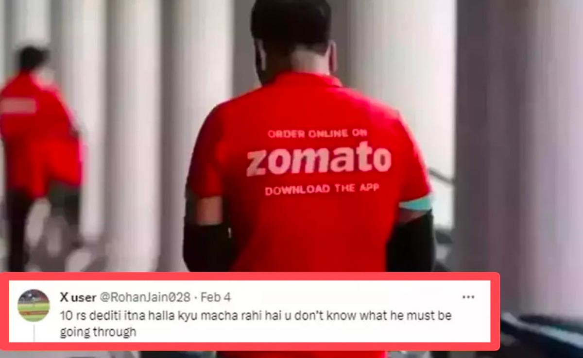 वायरल हो रहे इस पोस्ट के कैप्शन में यूजर ने लिखा है, अजीब है भाई. तीन फरवरी को शेयर किए गए इस पोस्ट को अब तक 1.6 मिलियन लोग देख चुके हैं, जबकि पोस्ट पर यूजर्स के कमेंट्स रुकने का नाम ही नहीं ले रहे हैं. देखा जा सकता है कि, कमेंट सेक्शन में लोगों ने डिलीवरी पार्टनर के अनुरोध का मजाक उड़ाने पर यूजर को जमकर खरी खोटी सुनाई है. एक यूजर ने लिखा, 'अजीब तो तू है भाई.' दूसरे यूजर ने लिखा, '10 रुपये दे देती इतना हल्ला क्यों मचा रही हो. तुम्हें पता नहीं है वो किस स्थिति से गुजर रहा होगा.' तीसरे यूजर ने लिखा, 'ट्वीट कर सकते हो लेकिन टिप नहीं दे सकती हो. सोचो अगर वो अपने स्पेशल नाइट को छोड़कर आया हो डिलिवरी करने तो.' चौथे यूजर ने लिखा, 'टिप मत दो लेकिन पोस्ट करके और ऐसे उसे शर्मिंदा मत करो.'
