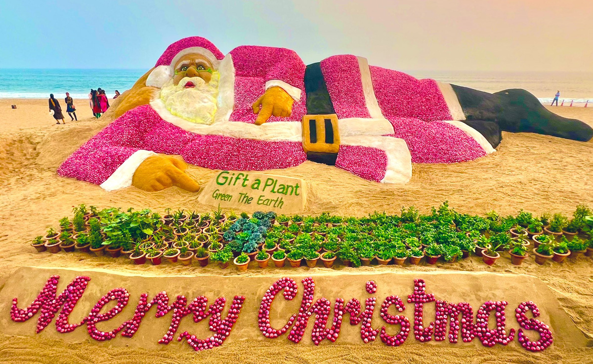 वर्ल्ड फेमस सैंड आर्टिस्ट सुदर्शन पटनायक ने क्रिसमस के मौके पर ब्लू फ्लैग समुद्र तट पर विश्व का सबसे बड़ा सेंटा (सांता) क्लॉज़ बनाया है. खास बात यह है कि, उन्होंने रेत और प्याज की मदद से सेंटा क्लॉज को बनाया है, जिसे देखने के लिए पुरी के समुद्र तट पर लोगों की भीड़ उमड़ रही है. अनोखे अंदाज में विश्व रिकॉर्ड बनाकर उन्होंने देश और दुनिया के लोगों को एक सुंदर संदेश भी दिया है.