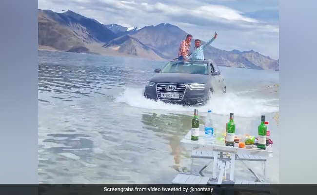 लद्दाख (Ladakh) बहुत ही खूबसूरत जगह है. देश भर के पर्यटक यहां घूमने आते हैं. यहां के पहाड़, झीलें, मोनेस्ट्रीज और बेहद खूबसूरत नजारे इन पर्यटकों को बार-बार लद्दाख लेकर आते हैं. कई लोग लद्दाख बाइक से आते हैं. इसकी वजह है कि लोगों को यहां के नज़ारें बहुत ही ज्यादा पसंद हैं. वहीं कुछ लोग ऐसे हैं, जो अपनी मस्ती के लिए यहां की खूबसूरती के साथ खिलवाड़ करते हैं. सोशल मीडिया पर एक ऐसा ही वीडियो वायरल हो रहा है. वायरल वीडियो में देखा जा सकता है कि कुछ युवक पैंगोंग झील (Pangong Lake) के पानी के ऊपर गाड़ी चला रहे हैं.