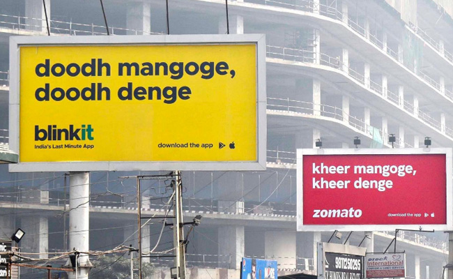 दरअसल, हाल ही में ऑनलाइन ग्रॉसरी डिलीवर करने वाली ऐप ब्लिंकिट (BlinkIt) और ऑनलाइन फूड डिलीवरी ऐप जोमैटो (Zomato) ने अपने विज्ञापनों से लोगों का ध्यान अपनी ओर खींच लिया है, जिसकी तस्वीर इन दिनों सोशल मीडिया पर खूब वायरल हो रही है. हालांकि, कंपनियों का अपने विज्ञापन में कुछ अतरंगी करना कोई नयी बात नहीं है. खासतौर पर स्टार्टअप्स तो हमेशा कुछ न कुछ नया ट्राई करते ही रहते हैं. इसी कड़ी में इन दिनों ब्लिंकिट और जोमैटो के नए बिलबोर्ड ऐड के जरिये धूम मचा रखी है.