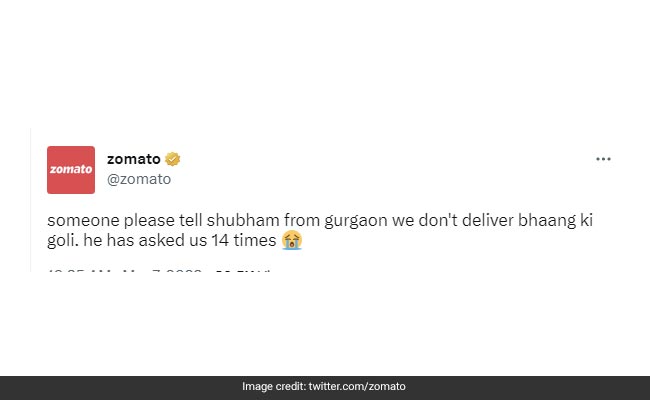 जानी-मानी फूड डिलीवरी कंपनी जोमैटो से शुभम नाम के लड़के ने कुछ ऐसा कुछ मंगवाया, जिसे डिलीवर न कर पाने की मजबूरी जोमैटो ने ट्विटर पर जाहिर की. दरअसल, जोमैटो ने अपने ऑफिशियल टि्वटर हैंडल से ट्वीट कर लिखा, 'प्लीज गुड़गांव में रहने वाले शुभम को कोई यह बताए कि, हम भांग की गोली डिलीवर नहीं करते हैं. वह इस बारे में हम से 14 बार पूछ चुके हैं '. जोमैटो के ट्वीट के बाद इंटरनेट पर लोगों की अलग-अलग प्रतिक्रियाएं सामने आ रही हैं. कोई लेट डिलीवरी का कमेंट सेक्शन पर गुस्सा निकाल रहा है, तो कोई कह रहा है कि हाई डिमांड है. जोमैटो को होली पर गुजिया फ्री में डिलीवर करना चाहिए. हालांकि, इस बीच सबसे मजेदार रिएक्शन दिल्ली पुलिस का आया, जिसमें सभी को हैरान कर दिया.